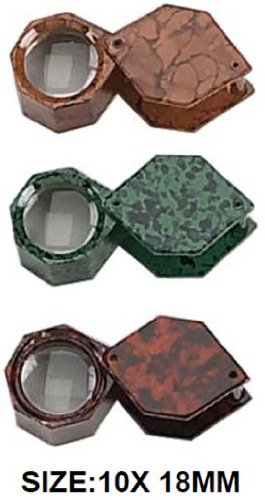 Trendy And Useful, These Delightful Loupes Add A Sparkle To The Daily Business. It Is 10x, 21mm Diameter, And Made Of Brass. Focal Length Is 1". Colors Available: Raspberry, Toffee, Mint Green And Tangerine, All In A "marbled" Pattern In A Hexigonal Shape. Dimension Is About 1 1/4" X 1" X 1" Folded. It Comes With A Brown Leatherette Case.